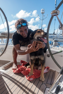 say no problem. Dalia, a young German Shepherd, was impeccably behaved, sleeping in Tuarae's arms in the cockpit, her bladder holding out until we were an hour from our destination - though she left us a lot of dog hair as a souvenir!